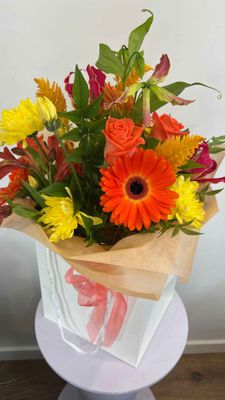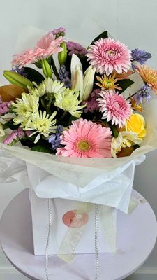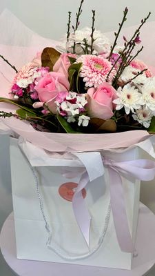 A charming hand-tied flower bouquet presented in a sweet posy bag — effortless, elegant, and ready to give. Featuring fresh seasonal blooms, each bouquet is thoughtfully arranged to bring instant joy, whether it’s a thank-you, a surprise, or a little treat for yourself.